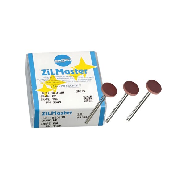El ZiLMaster WH6 HP Medium (ref. 0649) es parte del sistema de pulido ZiLMaster de SHOFU, un sistema impregnado con alrededor de un 75 % de partículas de diamante, desarrollado específicamente para restauraciones CAD/CAM como zirconia y disilicato de litio.